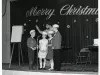 One black and white photograph of Toby David as Captain Jolly and four children on stage. The children, all wearing Popeye sailor caps, stand around a microphone while David stands behind them with his right arm held up in a conductor-like pose. To the left, an easel holds a large pad of paper on which a humanoid figure has been drawn. A dark curtain behind them holds a glittery "Merry Christmas" sign as well as some snowflake cutouts. To the right are a metal folding chair and a table holding more Popeye sailor caps. A black ink stamp on verso reads, "Michigan Bell Tel. Company Photographic. Jan 16 1961, Job No. 60-2230-14."