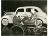 Black and white photographic print of Henry (right) and Edsel (left) Ford seated in a 1896 quadricycle, facing each other at the celebration of the 25 millionth Ford. A Ford Deluxe V8 "Humpback" Sedan is in the background. The ceremony took place on January 18, 1937 at the Rouge Plant. On the back of the print, "677148" is written in pencil.