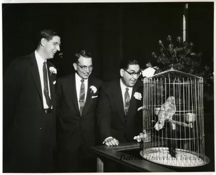 One black and white photograph of three men, including Toby David (right), who are looking at a bird in a cage. The three men are wearing dark suits with white carnations in their lapels and are smiling as they look at the bird. Behind the cage, a large bouquet of roses can be seen. A black ink stamp on verso reads, "Ransier-Anderson Photography 3408 Woodward Ave. Detroit 1, Michigan. C2452-48."
