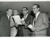 One black and white photograph of four men, including Toby David (second from right), who are standing together and looking at a horse race program. The two men on the left are laughing. David holds the booklet with his right hand and a ten dollar bill in his left. The man at the right looks at the booklet and holds a stack of dollar bills in his left hand. Three of the men a wearing business suits and one is wearing a sport coat. A black ink stamp on verso reads, "Ransier-Anderson Photography Inc. 4460 Cass Ave. Detroit, Michigan 48201."