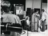 One black and white photograph of Toby David (second from right) and three others on the set of CKLW 9 TV as part of their 20th Anniversary Celebration. In the left foreground, a man is operating a camera which has a sign on the side that reads, "CKLW 9 TV." The other three men stand on the replica set of Popeye and Pals. David stands at the center dressed as his character, Captain Jolly, and speaks to a man to the right. Another man, to the left of David, sits in a chair and holds puppets in his lap.