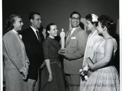 One black and white photograph of Toby David (left) and a priest (right) who are both holding the base of a small white statue of St. Martin de Porres. They are smiling at each other. Presumably, the priest is presenting the statue to David.