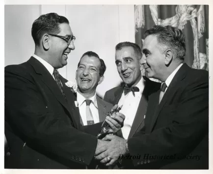 One black and white photograph an unidentified man (right) shaking the hand of Toby David (left) as two other unidentified men stand in the center background. David wears a white carnation in his lapel and holds a small silver statue in his left hand. A white wall and patterned curtains are visible in the far background.