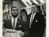 One black and white photograph of Toby David (left) standing with a man in front of a Pontiac display at the Detroit Auto Show. David holds an open pamphlet in his hands and smiles upward. The man to his right holds his hands at his sides and smiles into the camera. Behind them, a car can be seen raised on its side to reveal the undercarriage. Above this car is a large sign which reads, "Pontiac."