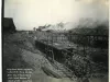 Photograph. Sepia-toned photo of the Lonyo Road Sewer under construction. Printed text in the lower left corner of the photo shows "Lonyo Road Sewer, Adjacent to M.C.R.R. Aug. 30, 1919, After Slip of Waste Bank which raised bottom 13' above grade; [W. B.] James Photo." The view shows a wide, excavated trench in the foreground along with track-mounted steel forms for constructing a large, double-barrel cast-in-place concrete sewer. The photographer noted the location of a nearby waste pile of excavated material (marked by arrow near center of photo) that collapsed and caused the sewer grade line to heave upward as noted by the upward-pointing arrow near the left side of the photo.