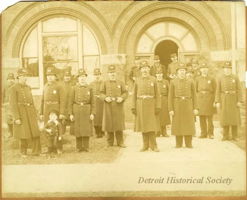 Print. Sepia-toned photographic print depicting a group of uniformed police officers and a small boy posing in front of the arched window and door of the Seventh Precinct on Canfield. Photo is mounted on beige cardstock. Printed on verso: