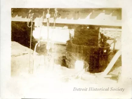 Photograph. Sepia-toned photo showing an area of the the River Rouge Bascule Bridge construction site. The view shows railroad track ties at the top of the photo. Beneath the ties there are various pieces of equipment including a block and tackle, piping, and formwork.