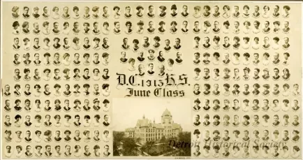 Black and white composite photograph of the Detroit Central High School class of June 1913. The photograph shows students, faculty and a photograph of the building at bottom center. Text underneath the image of the building reads "J.W. Hughes Photo." Mounted on board.