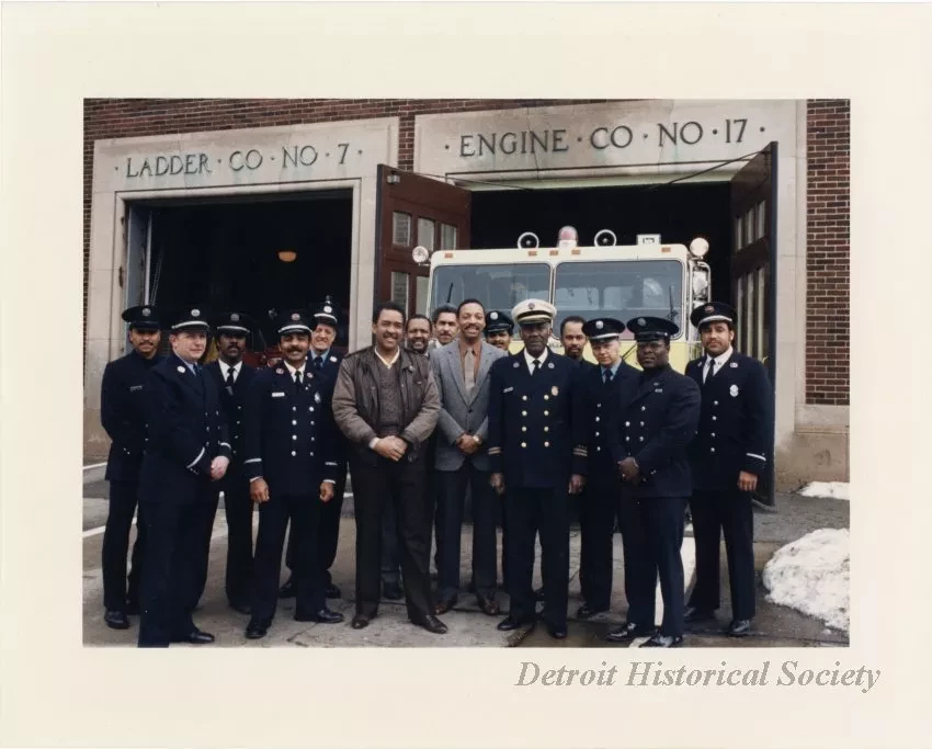 Color portrait photograph taken of fifteen men, most in Detroit Fire Department dress uniforms, posed in front of the fire station of Ladder Company No. 7 and Engine Company No. 17, at 6100 Second Avenue. One of the company's fire trucks is partially emerged from one of the large bay doors in the background.