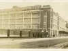 Small sepia-toned photographic print depicting the exterior of the Ford Highland Park Plant, as taken from the vicinity of the south corner of Manchester Street, and John R Street. Several pedestrians, including a group of three adults, three children, and a baby walk along the sidewalk. A "No Parking" sign is in the foreground at the lower right. Show covers the ground. "Mar 1922" handwritten on verso.