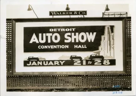 Black and white photographic print depicting a Walker & Co. billboard displaying an advertisement for the Detroit Auto Show reading, "Detroit Auto Show, Convention Hall, January 21 to 28".