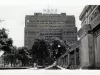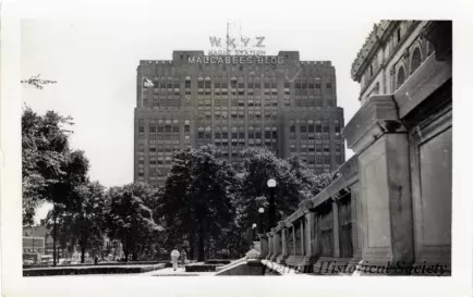 Black and white photograph of the north elevation of the Maccabees Building. Affixed to the top of the structure is the WXYZ Radio Station sign and tower. The Maccabees Building is located on west side of Woodward Avenue, at Putnam Street. The Detroit Public Library is visible in the foreground.