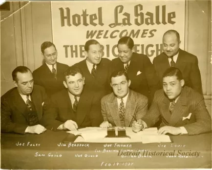 Photograph (and one 4" x 5" negative). Sepia-toned photo of a press conference at the Hotel La Salle, Chicago, for "The Big Fight" which took place at Comiskey Park. The names of the conference attendees are handwritten in white text along the bottom of the photo as follows: back row (left to right): Sam Gould, Joe Gould, Julian Black, John Roxborough; front row (left to right): Joe Foley, Jim Braddock, Joe Tainer (Illinois Boxing Commissioner), and Joe Louis. This picture is dated February 19, 1937.