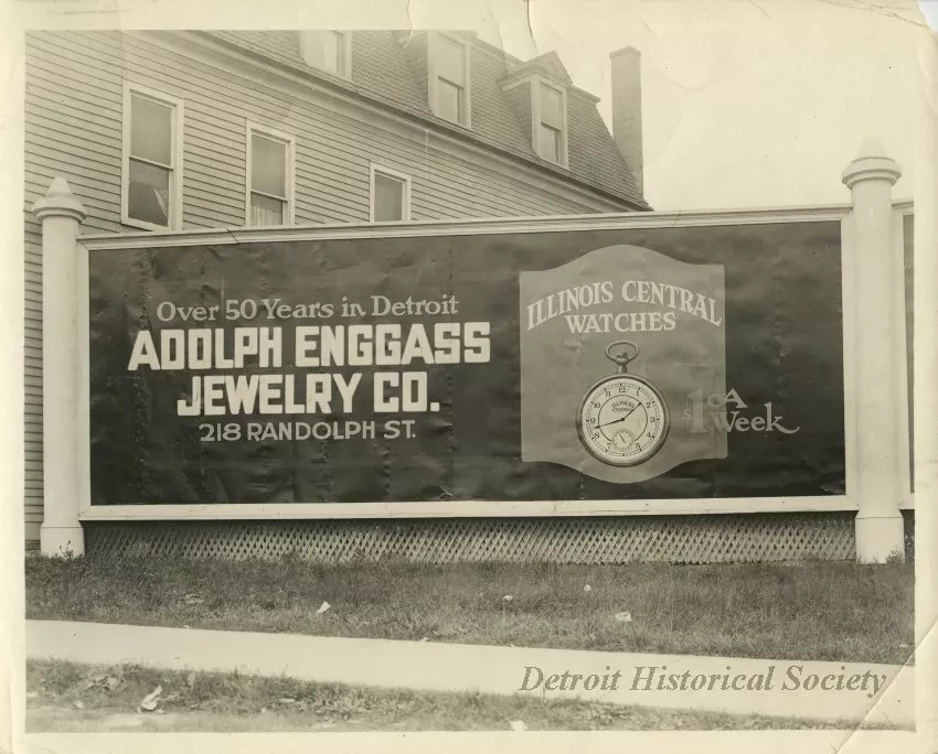 Black and white photographic print depicting a Walker & Co. billboard displaying an advertisement for the Enggass Jewelry Co. reading, "Over 50 Years in Detroit, Adolph Enggass Jewelry Co. 218 Randolph St., Illinois Central Watches $1 A Week". In the background is a house.