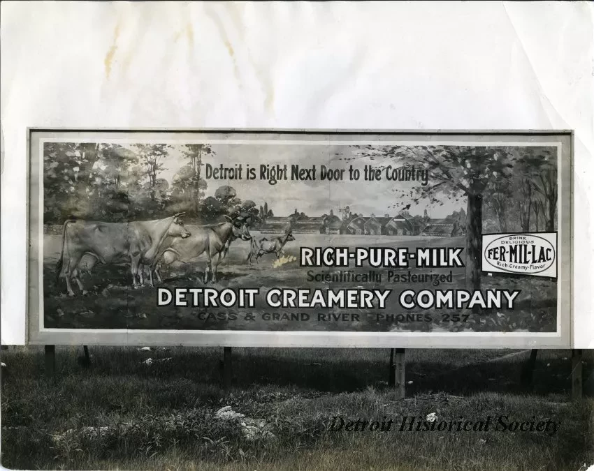 Black and white photographic print depicting a Walker & Co. billboard displaying an advertisement for the Detroit Creamery reading, "Detroit is Right Next Door to the Country, Rich-Pure-Milk Scientifically Pasteurized, Detroit Creamery Company, Cass & Grand River, Drink Delicious Fer-Mil-Lac Rich-Creamy-Flavor" and showing cows.