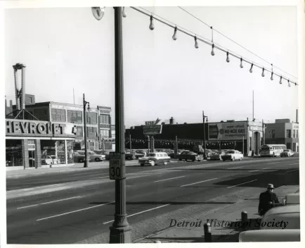 Black and white photographic print depicting neon and bulb signage at Jerry McCarthy Chevrolet at 6250 Woodward Avenue. Other businesses in view include Shelby Lithographing Co., Inc., and Gulf Oil Corporation. A sign reads "Cleaner-Burning, Gulf, super-refined No-Nox Gas, more power-with-protection".