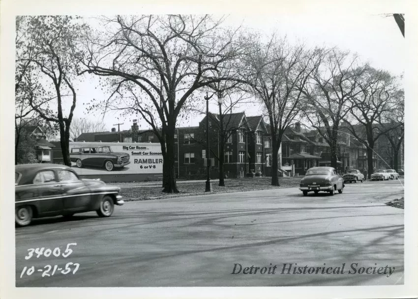 Black and white photographic print depicting a Walker & Co. billboard displaying an advertisement for Rambler reading, "Big Car Room -Small Car Economy, Rambler 6 or V-8". In view are cars on an unidentified street lined with apartments and tall trees.