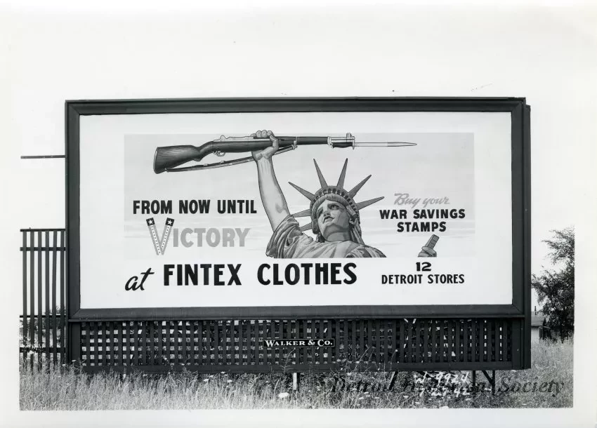Black and white photographic print depicting a Walker & Co. billboard displaying an advertisement for Fintex Clothes reading, "From Now Until Victory, Buy your War Savings Stamps at Fintex Clothes, 12 Detroit Stores" and showing the Statue of Liberty holding a rifle.