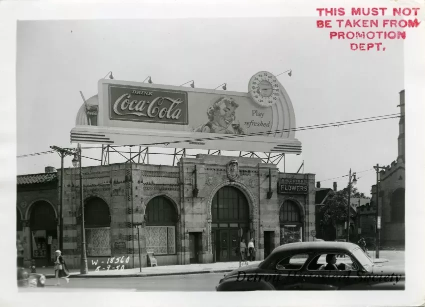 Black and white photographic print depicting a Walker & Co. billboard displaying an advertisement for Coca-Cola reading, "Drink Coca-Cola, Play refreshed", and incorporating a thermometer. In view is a commercial building on the southeast corner of Grand River Avenue and Trumbull Street housing Higgins Flowers. In the foreground is a passing car, and in the background is Trinity Episcopal Church.