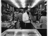 Black and white photographic print mounted on board depicting the inside of a Judaica shop, crowded with several people. Items for sale include books, menorot, bottles of wine, and "Elite Wafers". A man in the foreground wears a yarmulke and tzitzit. A sign on the back wall reads "Walk In, Browse Around: a Complete Selection of Jewish - Hebrew - English Books for Home, School, Synagogue, and Occasional Gifts" and a decorative dreidel hangs from the ceiling. Also in view are a cash register and roll of tape.