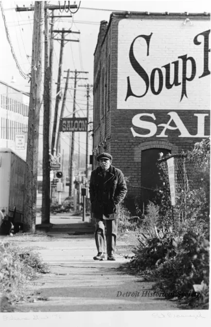 Black and white photographic print mounted on board depicting an African-American man walking north on Orleans Street, with the Soup Kitchen Saloon and the intersection of Franklin Street in the background.