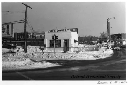 Black and white photographic print mounted on board depicting Vic's Donuts on Lapeer Avenue in Port Huron, with a Chevrolet Corvette parked nearby and snow covering the ground. Signs read "Donuts and Coffee" and "Homemade Chili and Kielbasa". St. Clair County Community College and McMorran Place are visible in the background. Cars cross the Erie Street bridge over the Black River toward the camera.