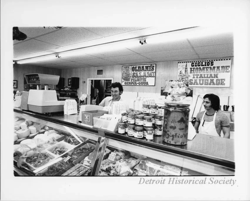 Black and white photographic mounted on board depicting two men wearing white aprons standing behind a deli counter at Giglio's Italian Market on the west side of Gratiot Avenue. In the background, two signs can be seen, one reading "Oldani's Salami Filsette Genova-Coppa" and the other "Giglo's Homemade Italian Sausage". A glass display case can be seen in the foreground, displaying wheels of cheese and cuts of meat. Small signs in the case give the prices of the meat per pound. On the counter above the display case is a scale, paper containers, boxes, jars reading "Giglio's", a large jar reading "Giglio's" with a sign on top reading "Lazy Garlic".