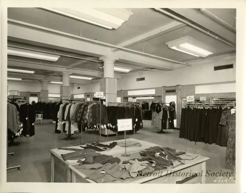Sepia-toned photo of the women's outer wear department within Crowley Milner's, taken from a photo album of air conditioning installations done by the Detroit Ice Machine Company in 1937. A table of coat sweaters are in the foreground. Racks of coats, fall jackets, suits, sport coats, fur coats, skirts, and discounted spring coats and suits are in the background. Vents are visible nears the top of the walls. "M-2018," is printed in the lower right corner of the photo, corresponding to the description "Air Duct Women's Wearing Apparel Dept.," on the table of contents page (2008.039.003). The photo is mounted on a linen photo album page with a flap on the left hand side with three holes for binding.