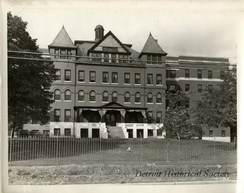 Sepia-toned photo of the exterior of County Hospital at Eloise, as viewed from outside the fence around the ground, taken from a photo album of air conditioning installations done by the Detroit Ice Machine Company in 1937. "M-2010," is printed in the lower left corner of the photo, corresponding to the description "25 Ton Frick Freon Compressor," on the table of contents page (2008.039.003). The photo is mounted on a linen photo album page with a flap on the left hand side with three holes for binding.