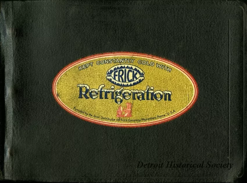 Sepia-toned photo of the exterior of the Radner Beef Company, presumably on Deming Street, taken from a photo album of air conditioning installations done by the Detroit Ice Machine Company in 1937. The brick building has a loading bay set into its front face, and a three tiered stepped roof. A car is parked in a driveway on the left side of the building. "30128, S&W," is printed near the lower right corner of the photo, corresponding to the description "Slaughter House," on the table of contents page (2008.039.003). The photo is mounted on a linen photo album page with a flap on the left hand side with three holes for binding. A "Spence and Wyckoff, Commercial Photographers, Detroit," stamp is on the verso.