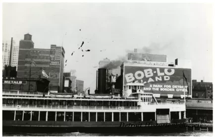 Black and white photograph showing a starboard side view of the forward section of the Detroit and Windsor Ferry Company auto and passenger ferry BRITANNIA docked at the Detroit and Windsor Ferry Company docks at the foot of Woodward Avenue. A Bob-Lo Island sign on the side of the ferry company's building and the J.T. Wing & Company building opposite it are visible on the shore in the background.