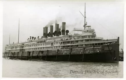 One sepia-toned photograph of the passenger steamship, SS Seeandbee, of the Cleveland & Buffalo Transit Company. The photo shows a starboard side bow view of the ship which moored at a dock and is having some repainting work done on the upper section of the hull.