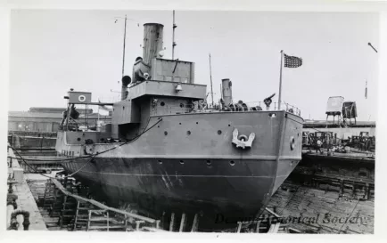 One black and white photograph of a U.S. Maritime Commission vessel under construction. The photo shows a starboard side bow view of the vessel which is resting in a drydock. Handwritten text on the verso reads "Formerly SS Cadillac" and "Winter of 1942-1943."