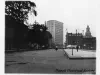 Black and white photographic print taken at street level on West Lafayette Boulevard, at roughly Washington Boulevard, facing east. Two cyclists are in the street, a man approaches on the sidewalk, and the Majestic Building and City Hall are in the background. "8/98" printed on verso.