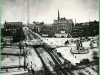 Photograph. Black and white photo showing aerial view of Campus Martius. Woodward Avenue is visible in the foreground and to the upper left side of the photo. Michigan Avenue is visible at the center left side. Monroe Street, the Soldiers and Sailors Monument, and Cadillac Square can be seen to the right. Businesses and storefronts that are visible include: the Detroit Opera House (with J. L. Hudson, Clothier, Hats & Furnishings), Hull Brothers Grocers, Chas. H. Werner Crockery and Glassware, Wright Kay Co., Mills & Barker Furniture, J. H. Black & Co., Hudson & Symington, and L. L. Farnsworth Shoes.