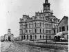Black and white copy of a photograph reprinted on photographic paper. Image depict a view eastward along Michigan Avenue, from just west of Griswold Street, capturing both the 1871 City Hall and the previous 1835 City Hall across Campus Martius. Along the south side of Michigan a storefront with an awning is visible. The road is paved with cobblestones. "Present City Hall in 1871 & old City Hall across Campus Martius" handwritten on verso.