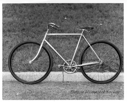 Photograph (and 3 copies). Black and white photo showing a side view of a man's bicycle that is leaning against a concrete curb. The bicycle is in fairly good condition and was made by the E & D (Evans & Dodge) Company. It is silver-colored, has a leather seat, new tires, and no fenders. The background area of the photo is a grass lawn. An ink stamp on the verso shows " City of Detroit Photo, Dept. Report & Information, 1008 City county Building, Detroit, Michigan 48226."