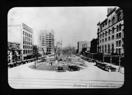 Black and white photographic print of a negative of Washington Boulevard, looking north from Michigan Avenue. In the median is the General Alexander Macomb statue. To the right is the Edison Illuminating Company of Detroit and Cadillac Hotel. To the left is the Reliable Furniture Company and Book Building under construction. Political advertisements for Judge Connolly are visible affixed to the facade of the building in the left foreground. Cars fill the street.