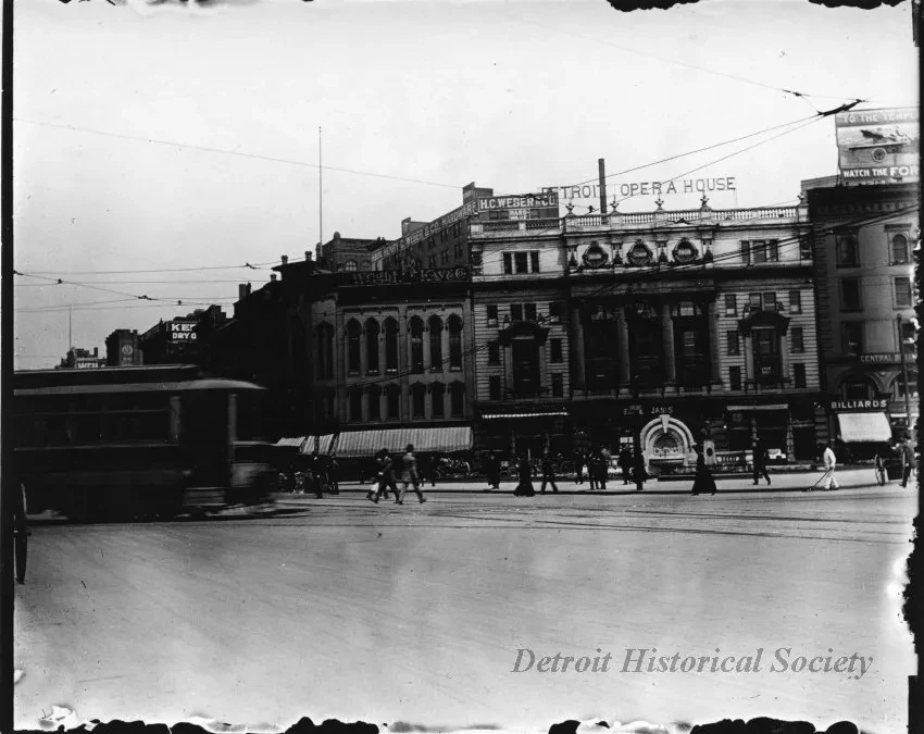Black and white photograph from a glass plate negative. Woodward Avenue is visible in front of the Detroit Opera House and the Palmer Fountain. Many pedestrians cross the thoroughfare; a street car travels along the tracks. The Wright and Kay Company; and H.C. Weber Hardware Company are also adjacent to the Opera House. Written on the verso, "From Woodward to Monroe North side looking north, 1910, Detroit Opera House."