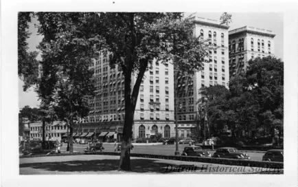 Black and white photograph of Wardell Apartment Hotel. Woodward Avenue runs in front of the structure, and East Kirby Street is the intersection route. Automobiles populate the thoroughfares of Kirby and Woodward.