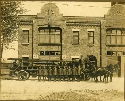 Mounted sepia-toned group portrait photograph of twelve members of the Detroit Fire Department's Ladder Company No. 11 posed with their horse-drawn ladder apparatus in front of their fire station on the north side of Milwaukee Street, west of Riopelle Street. Nine of the men stand along the brick-paved street beside the apparatus, while two men are seated at the front and one in the back.