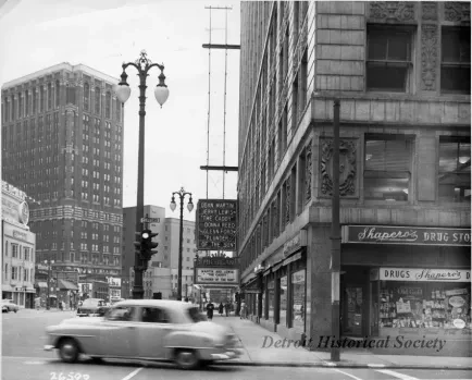 Black and white photographic print depicting the Michigan Building on the southwest corner of Bagley and Clifford Streets. The Michigan Theater marquee advertises "The Caddy" and "Plunder the Sun". In view are Shapero's Drug Store, the Michigan Bell Building and Hund's Grill. Traffic fills the street.