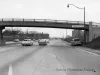Black and white street view photograph of the Canfield Avenue pedestrian bridge from the John C. Lodge Freeway, (M-10). Automobiles populate the thoroughfare's north-bound and south-bound lanes. A Walker and Company Outdoor Advertising Company car is stopped beneath the bridge; homes and businesses are adjacent to the busy freeway. Photograph number is printed in the lower left corner, "33313 c."