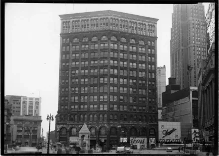 Black and white photograph of Campus Martius, facing west. In view are the First State Bank Building, Majestic Building, Bagley Memorial Fountain, David Stott Building, and the former Detroit Opera House. Businesses include United Cigars, Florsheim Shoes, Myer's Diamonds, Butler's Shoes, Drake's, and Sander's. First Federal Savings is south of the Majestic.