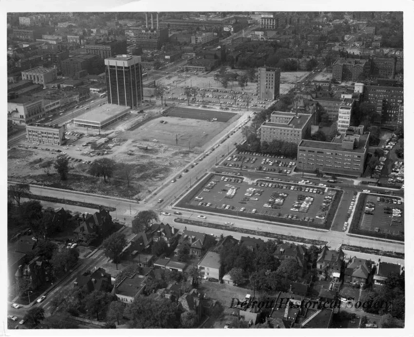 Black and white aerial photograph of Brush Park, the Detroit Medical Center, including Harper Hospital, Grace Hospital, Hutzel Women's Hospital, the Rehabilitation Institute of Michigan, and buildings of the Wayne State University School of Medicine, as well as the Professional Plaza taken facing the northwest from above Eliot Street between John R. Street and Brush Street. In contrast to the similar view of 2009.019.335, the roof of the Rehabilitation Institute is not under construction, the parking lot behind the Professional Plaza is being laid down, the Detroit Bank and Trust Company and the building near the southwest corner of John R. and Alexandrine are standing and the Wayne State Medical School building at 101 E. Alexandrine Detroit has yet to be built. Orchestra Hall and the Vernors Factory are visible along Woodward Avenue. "Med. Ccnt. - Phase #1" and "E-178-8" handwritten on verso.