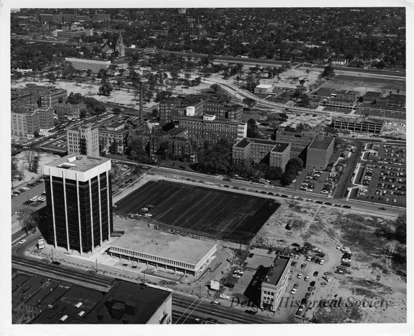 Black and white aerial photograph of the Professional Plaza and the Detroit Medical Center, taken from above Parsons Street near Woodward facing east. Harper Hospital, Grace Hospital, Hutzel Women's Hospital, Children's Hospital under construction, the Rehabilitation Institute of Michigan, Detroit General Hospital, and the buildings of the Wayne State University School of Medicine are all visible. A portion of Orchestra Hall is visible at the bottom of the frame. A construction sign for the H.F. Campbell Company is posted next to the Detroit Bank and Trust Company. St. Josephat Church, I-75, Sweetest Heart of Mary Church, and the Cadillac plant at Riopelle Street and East Warren Avenue are visible in the background. "Woodward, John R., Chrysler (I-75) Harper and Grace Hospitals, Orchestra Hall," handwritten on verso along with "E-178-4" and a stamp reading, "Dept. Report & Info. Comm."