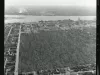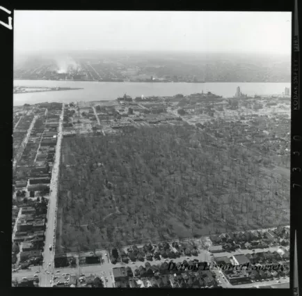 Black and white aerial photograph cut from a proof sheet taken of Mt. Elliott Cemetery, Elmwood Cemetery, the Island View neighborhood, and the Rivertown-Warehouse District taken from a point above Hunt Street and Ellery Street, facing south. Mt. Elliott Street extends parallel to the left border and Vernor Highway runs along the bottom. The riverfront, the Parke, Davis and Company complex, the Holnam and Medusa Cement silos, Belle Isle, the Detroit River and Windsor are all in the background. "M-2054," was handwritten on the verso of the proof sheet.