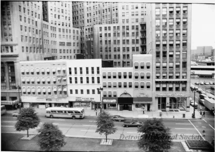 Black and white photograph of a series of businesses along the east side of Woodward Avenue between the First National Building and Congress Street. From left to right the businesses are Nicholson's Steak House, Hotel, Revco Discount Drug Centers; Koney Island Inn, Gus' Coney Island, and American Savings in the Vinton Building. A series of trees and greenspace is located in the foreground.