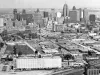 Black and white aerial photograph of downtown Detroit. View taken from above Mexicantown, roughly over 16th Street and Porter Street, facing east. Notable buildings along the skyline include (from left to right): Book Tower, J. L. Hudson's; Book Cadillac Hotel; 1001 Woodward Avenue; Penobscot Building; Guardian Building; One Woodward Avenue and the Pontchartrain Hotel. The completed first building of the Detroit Trade Center is near the center of the frame. The Detroit River is visible in the far right background.