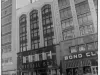 Black and white photo of storefronts along the west side of Woodward Avenue along Merchants Row between Clifford Street and Park Avenue including Grinnell Bros. and Bond Clothes.